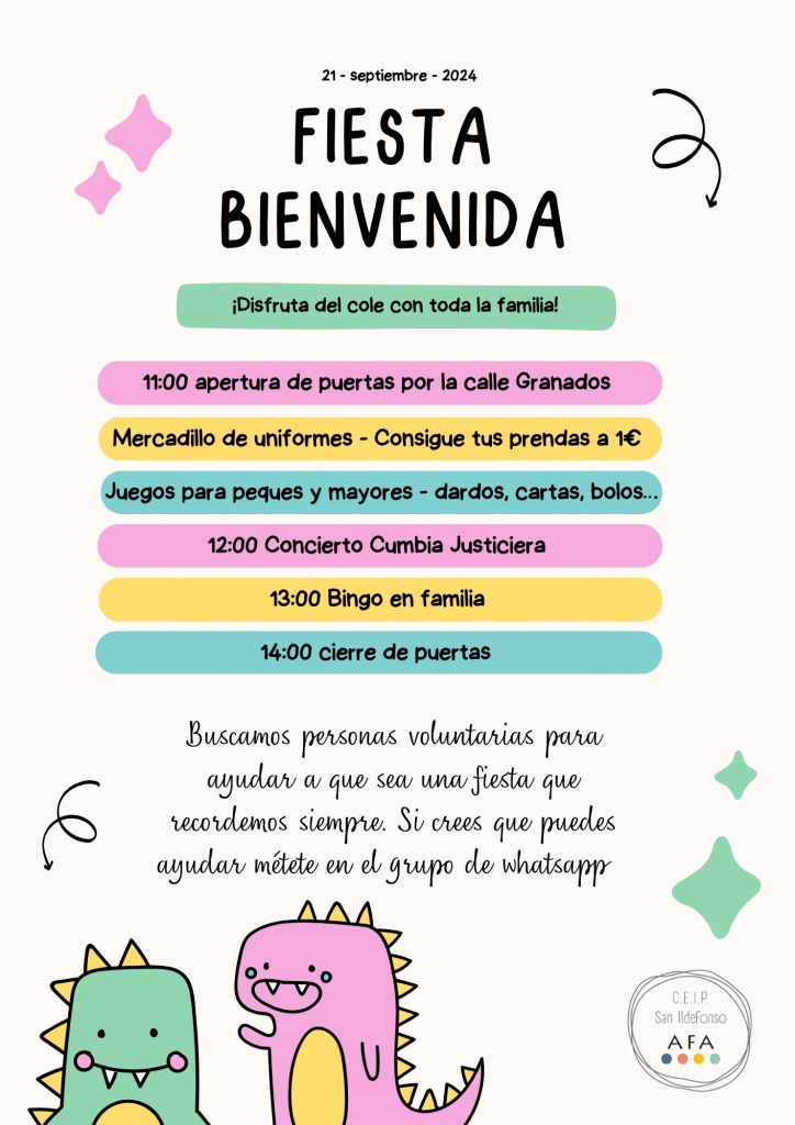 El próximo sábado 21 desde las 11 y hasta las 14 aprox celebraremos la Fiesta de Bienvenida del curso 2024/2025.